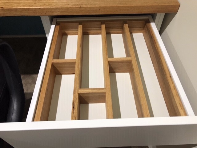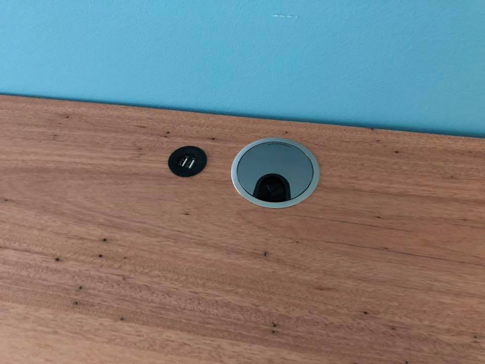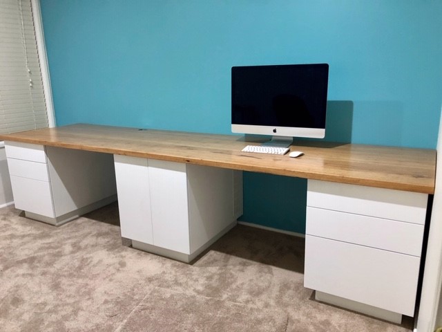 Wall to wall custom study desk from Blackbutt and vivid white polyurethane. Features include a printer slide, internal venting, pencil tray, built in USB hub, filing cabinet drawers and an under bench integrated bluetooth exciter speaker & hidden cable ducting.