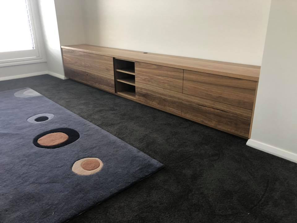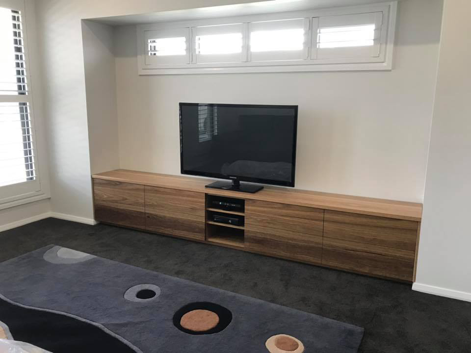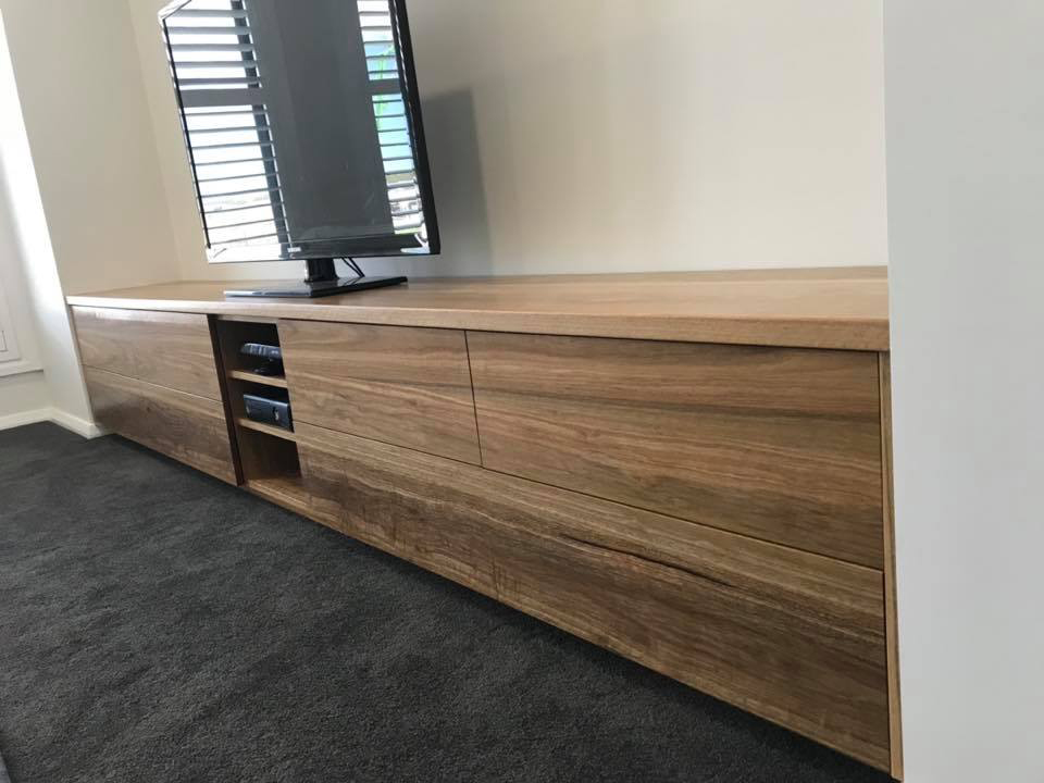 TV Unit 08/12/2019 TV unit in spotted gum, built wall to wall in the living room. Interested in custom furniture like this or have another design you need, custom timber, sizes or features? Contact Tuckers Lane Custom Furniture on 0408 38 38 02 or email us.